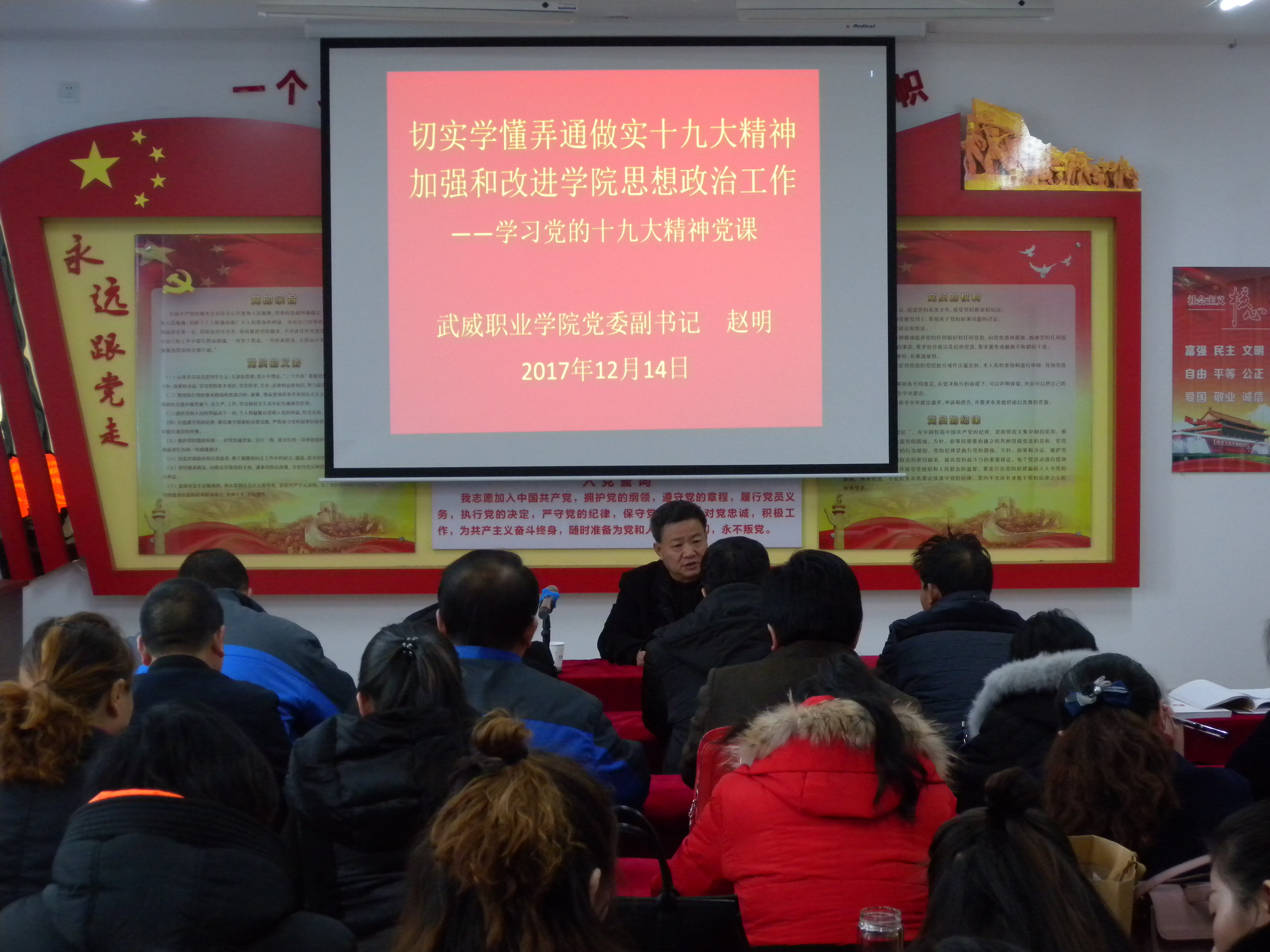 12月14日下午,人文藝術(shù)教育系黨總支邀請(qǐng)學(xué)院黨委副書記趙明同志到我系、馬克思主義學(xué)院講黨課,趙明同志結(jié)合自身學(xué)習(xí)十九大及習(xí)近平總書記在全國(guó)高校思想政治工作會(huì)議上的講話精神體會(huì),做了題為《切實(shí)學(xué)懂弄通做實(shí)十九大精神? 加強(qiáng)大學(xué)生思想政治工作》的黨課,全體教師聆聽了黨課。