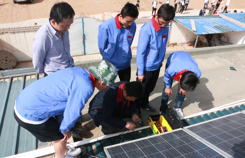 走進圓夢新村,由學(xué)院校辦企業(yè)武威泰豐新能源有限公司建設(shè)的200戶貧困家庭戶均3kw的分布式光伏發(fā)電系統(tǒng)映入眼簾。在社區(qū)書記郭林春的帶領(lǐng)下,黨員教師和學(xué)生入黨積極分子上門幫助用戶檢查維修光伏發(fā)電設(shè)備,檢查光伏組件的老化跡象以及所有連接器是否連接緊密、有無腐蝕現(xiàn)象,檢查組件是否接地良好。了解農(nóng)戶的需求,為農(nóng)戶講解光伏設(shè)備后期維護、電費結(jié)算方式以及國家扶貧惠民的政策等知識,并對部分農(nóng)戶屋頂光伏組件故障進行了排除,對光伏組件進行了大面積清潔維護。