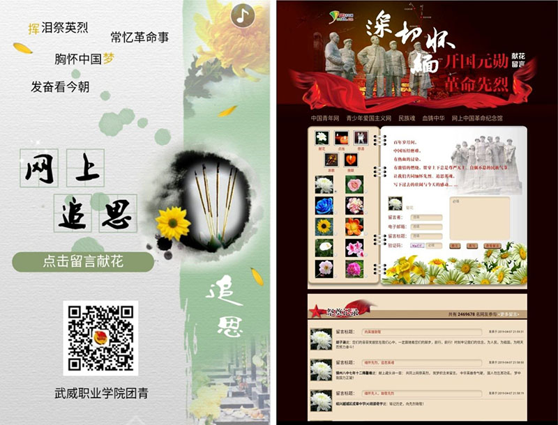 院團(tuán)委在“武威職業(yè)學(xué)院團(tuán)青”微信公眾平臺(tái)開設(shè)清明網(wǎng)上祭英烈專欄,共有3968名同學(xué)參與了線上活動(dòng)。同學(xué)們帶著誠(chéng)摯的敬意向烈士們鞠躬、獻(xiàn)花,并在留言區(qū)發(fā)表祭掃寄語,以此緬懷先烈的豐功偉績(jī),追憶烈士之德。