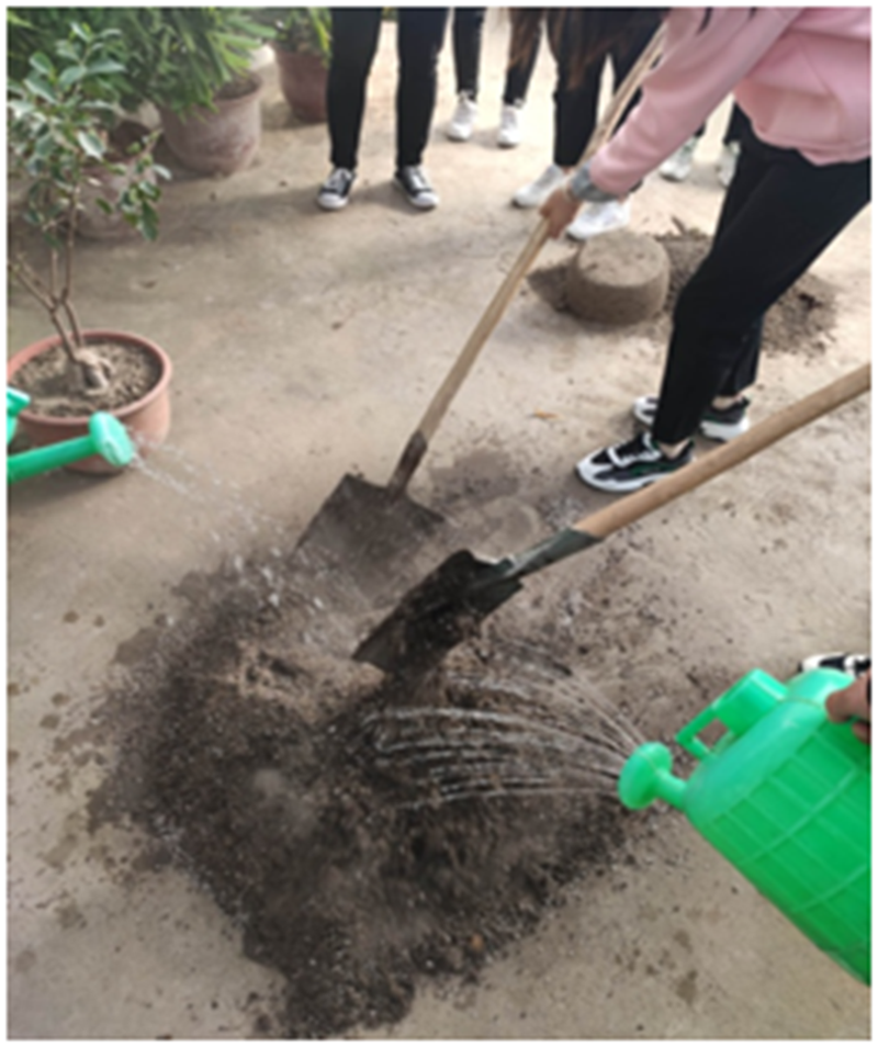 種植體驗(yàn)活動(dòng)前,為了讓學(xué)生更好地了解種植知識(shí),張老師給同學(xué)們講解了植物種植的條件、如何根據(jù)季節(jié)選擇種植的種類,以及育苗、澆水、施肥、防蟲過程中的注意事項(xiàng)。在活動(dòng)中,學(xué)生與老師合作完成種菜任務(wù),一起探討種植經(jīng)驗(yàn)、勞動(dòng)技能。