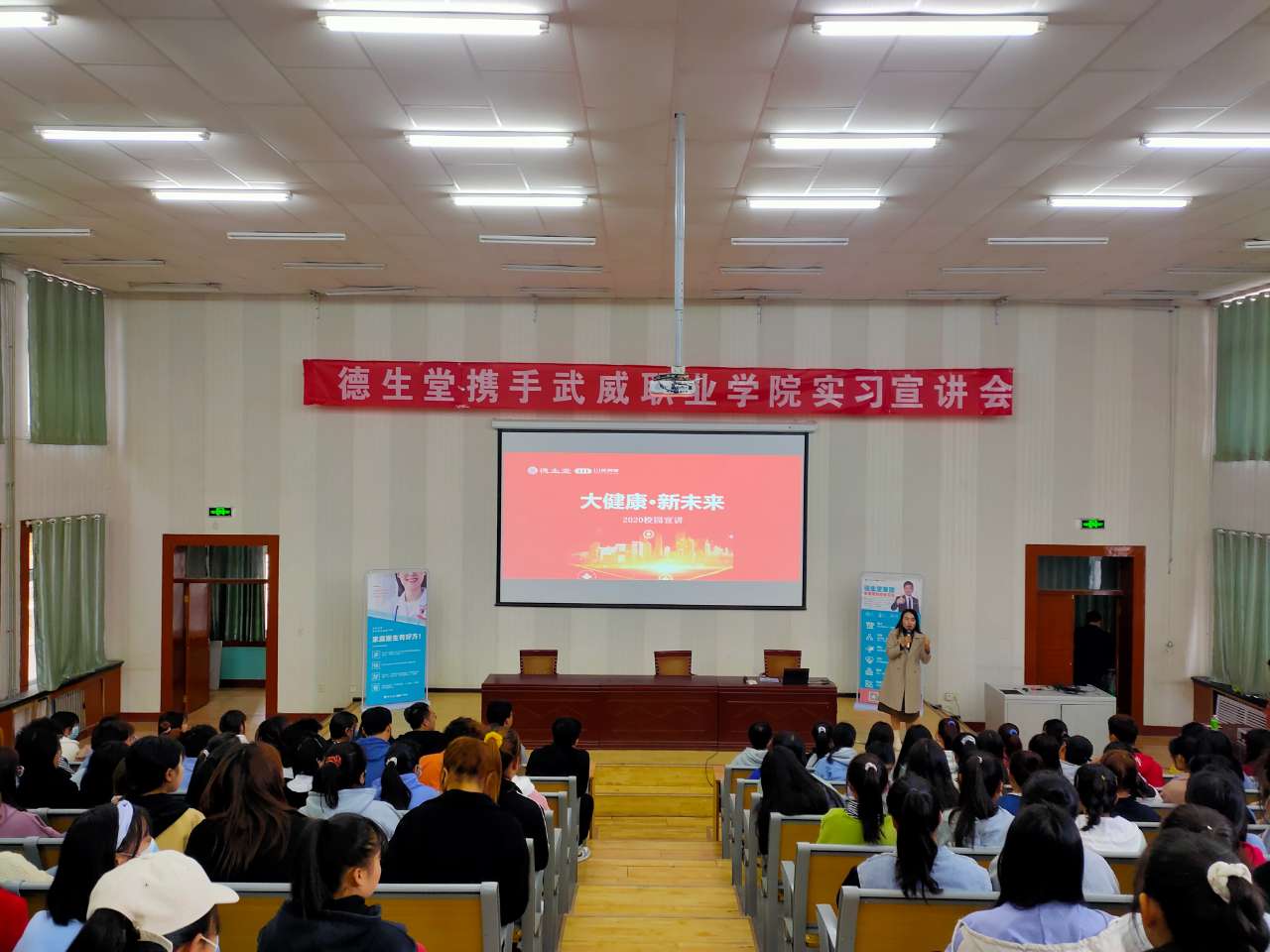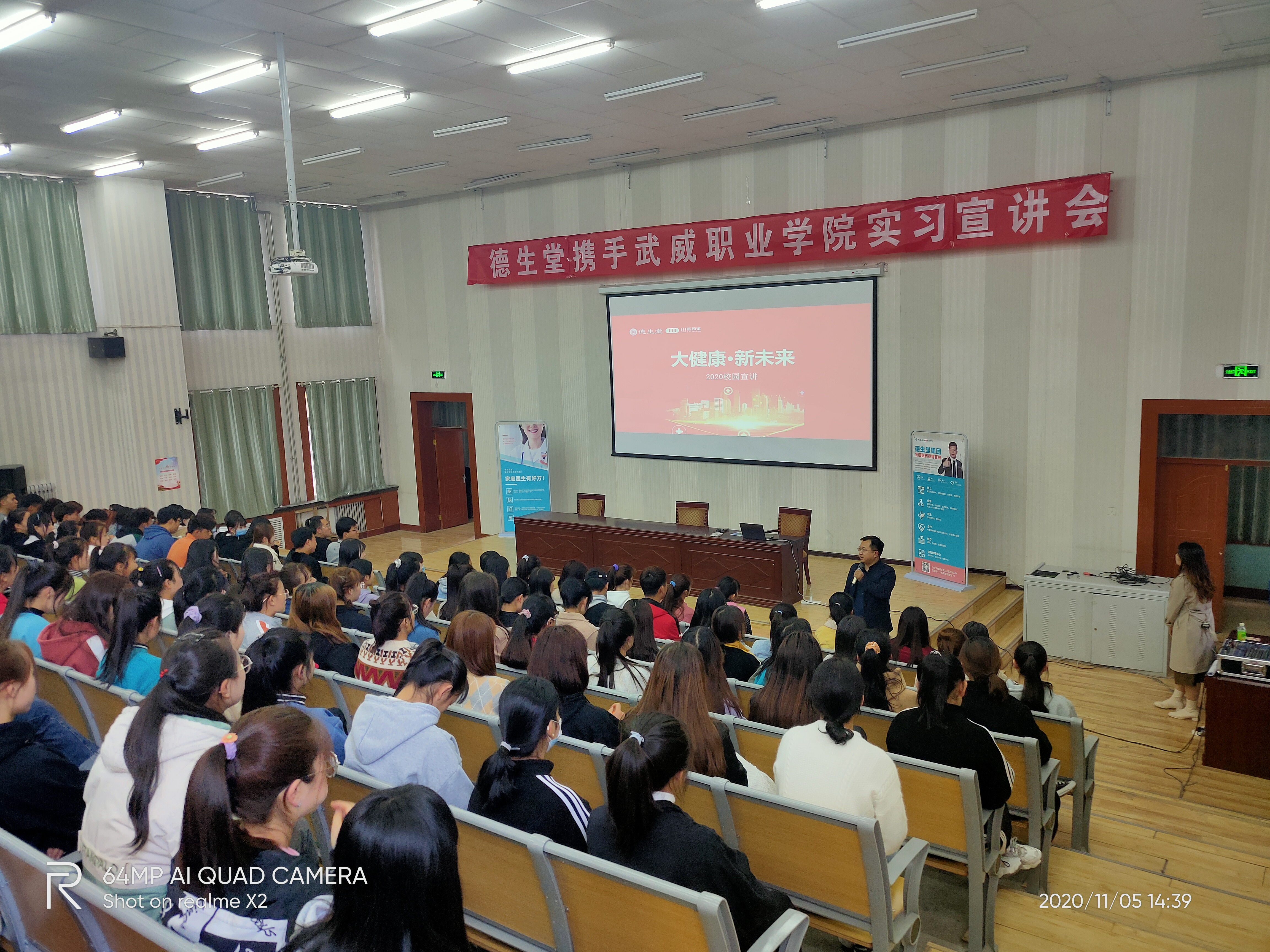 2020年11月5日,武威職業(yè)學(xué)院藥學(xué)系攜手德生堂在正德廳舉辦實習(xí)宣講會。藥學(xué)系黨總支書記、主任魏潤明、藥學(xué)系副主任楊建美、德生堂集團武威區(qū)域經(jīng)理呂福英及2021屆172名畢業(yè)生參加宣講會。