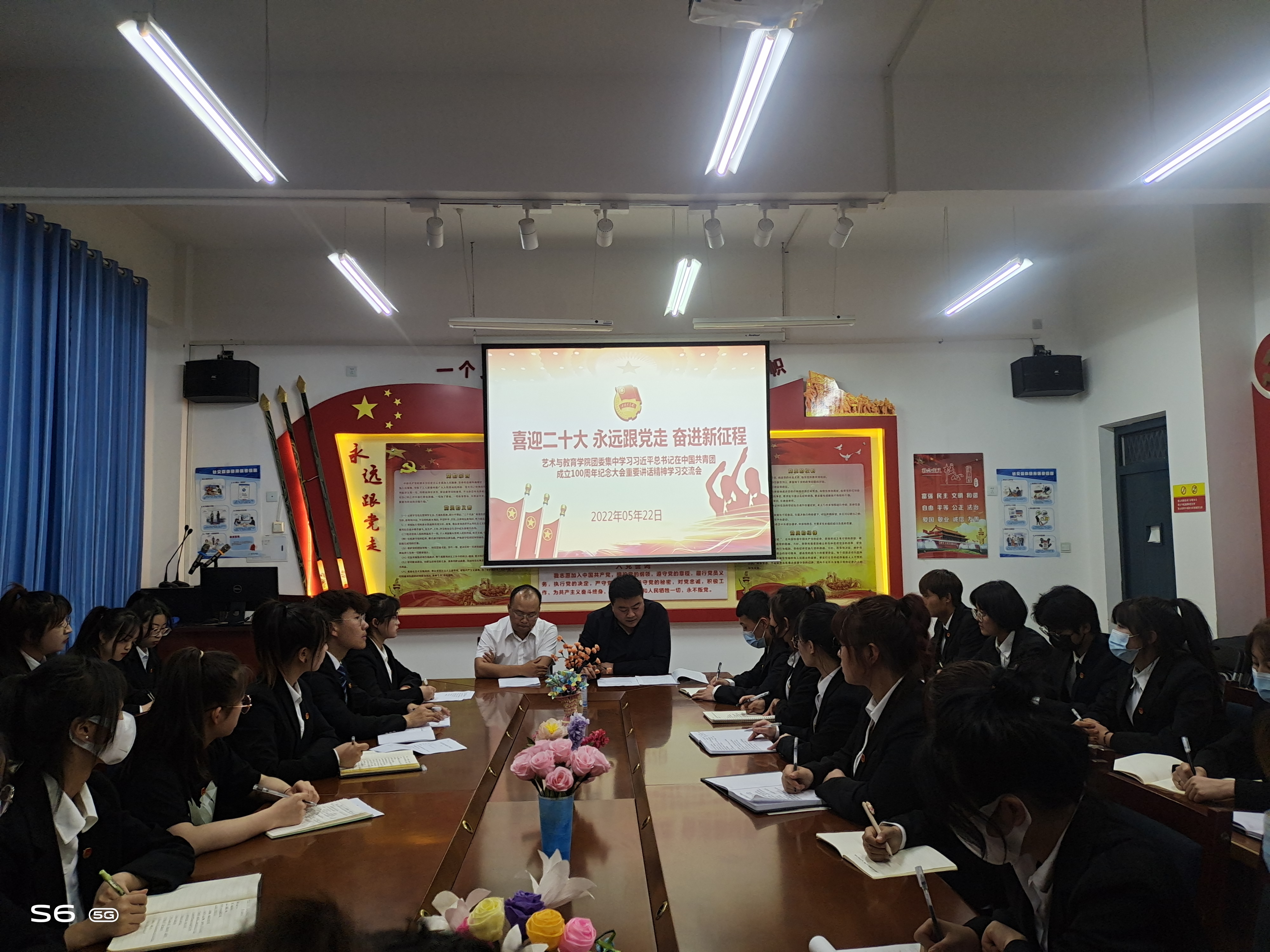 2022年5月22日晚,藝術(shù)與教育學(xué)院團(tuán)委以“喜迎二十大,奮進(jìn)新征程,永遠(yuǎn)跟黨走”為主題,開展習(xí)近平總書記在慶祝中國共產(chǎn)主義青年團(tuán)成立100周年大會上的重要講話精神學(xué)習(xí)研討交流會,參會人員由藝術(shù)與教育學(xué)院副院長李欣,團(tuán)委書記唐鑫基,20、21級各班團(tuán)支部書記及優(yōu)秀團(tuán)員代表、預(yù)備黨員、入黨積極分子和入團(tuán)積極分子代表組成。