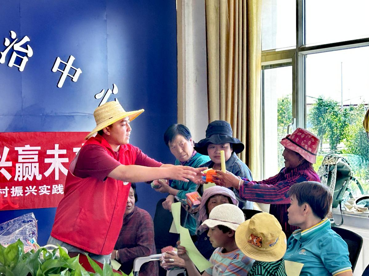 圖為實(shí)踐隊(duì)員為參與活動(dòng)的婦女發(fā)放推普彩頁和物品