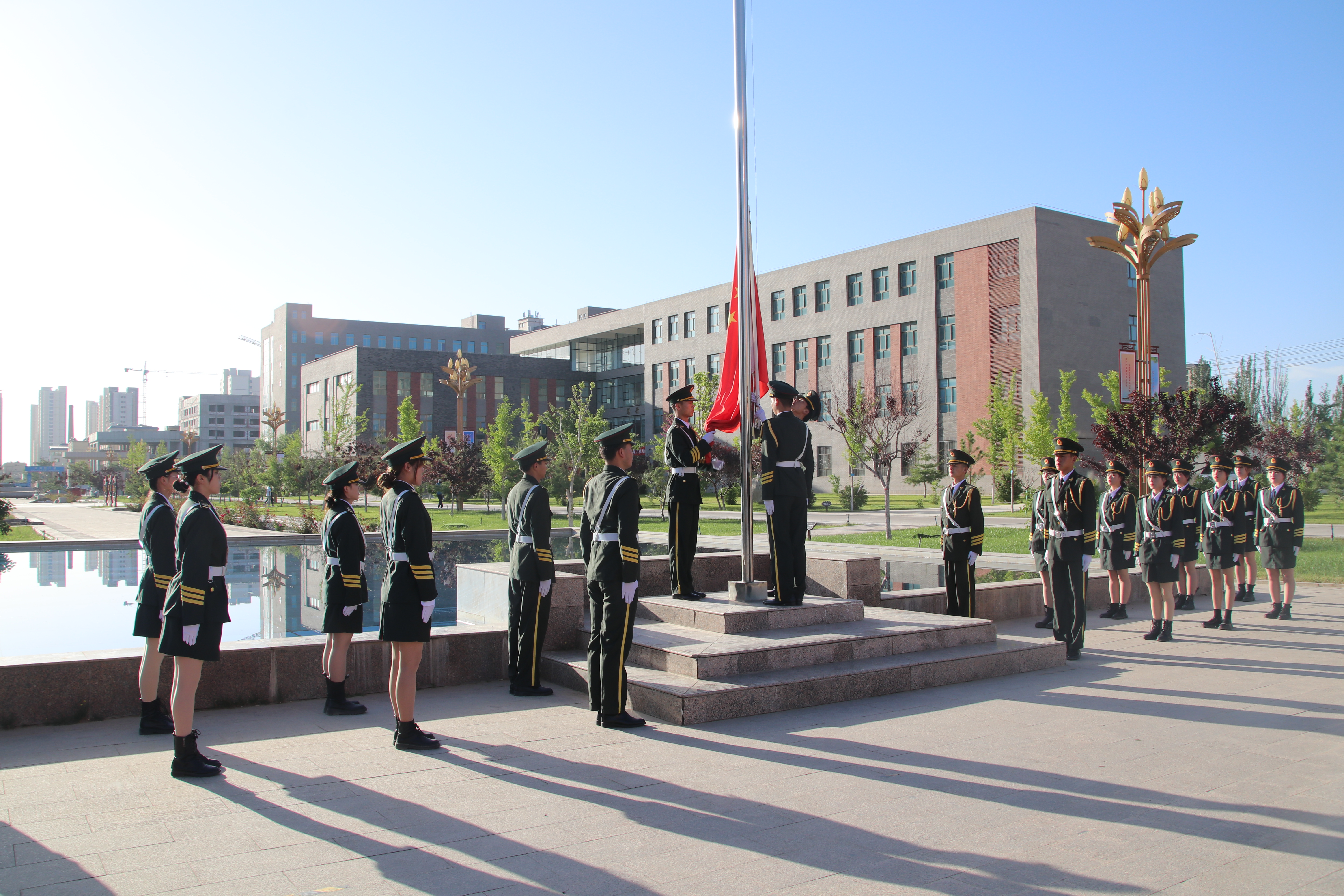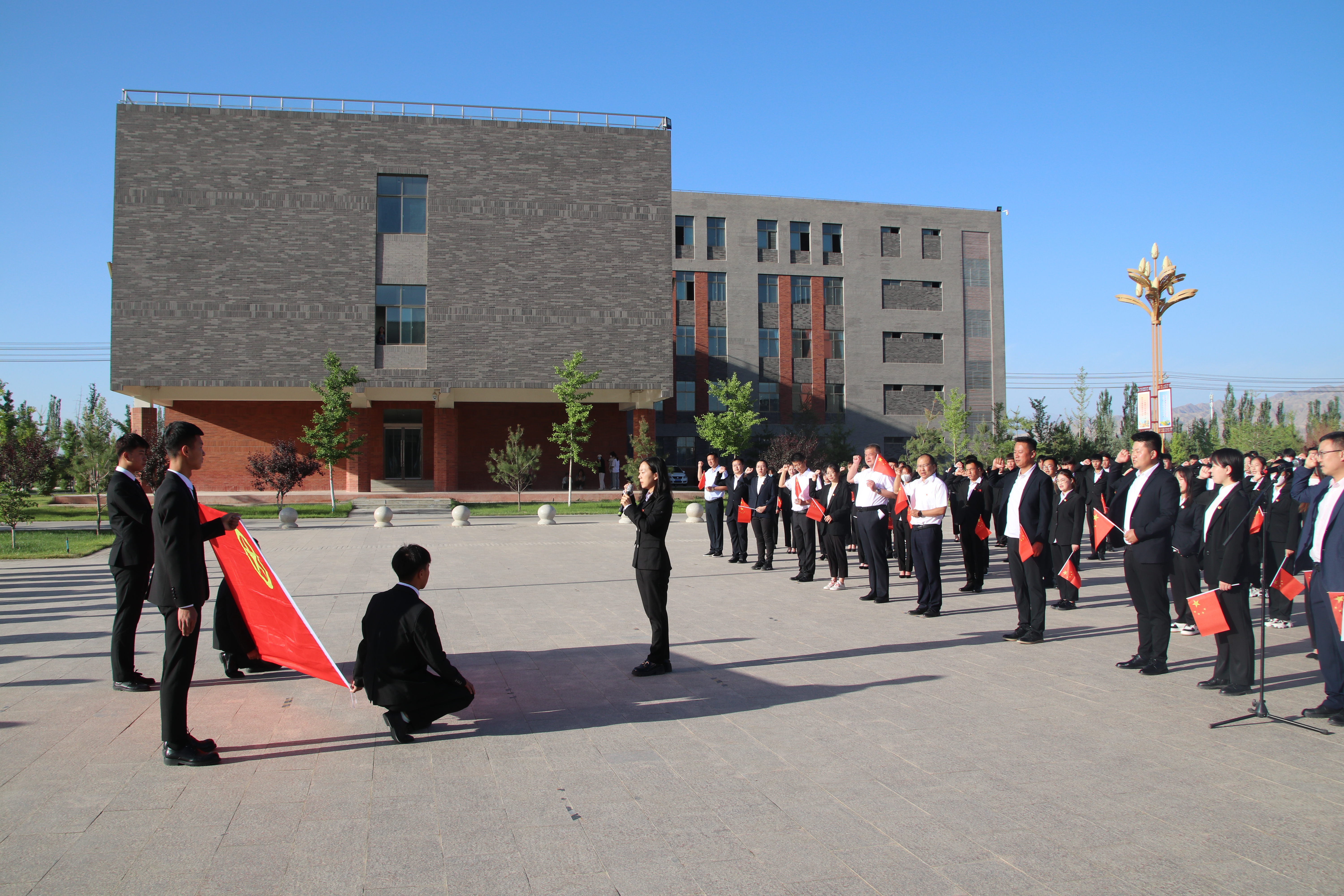 迎著朝陽,五星紅旗在國旗護(hù)衛(wèi)隊(duì)的護(hù)送下緩緩入場,昂昂國歌奏響,國旗迎風(fēng)飄揚(yáng),全場師生齊唱國歌。學(xué)生代表在國旗下致獻(xiàn)詞,對黨許下青春的誓言,獻(xiàn)詞之后舉行了嚴(yán)肅莊重的重溫入團(tuán)誓詞儀式,增強(qiáng)了共青團(tuán)員的組織光榮感和歸屬感,激發(fā)了團(tuán)員青年的使命感和責(zé)任感。最后,全體團(tuán)員青年齊唱《共青團(tuán)團(tuán)歌》,用響亮的歌聲表達(dá)建團(tuán)百年再出發(fā)的祝福,現(xiàn)場愛國熱情持續(xù)高漲。