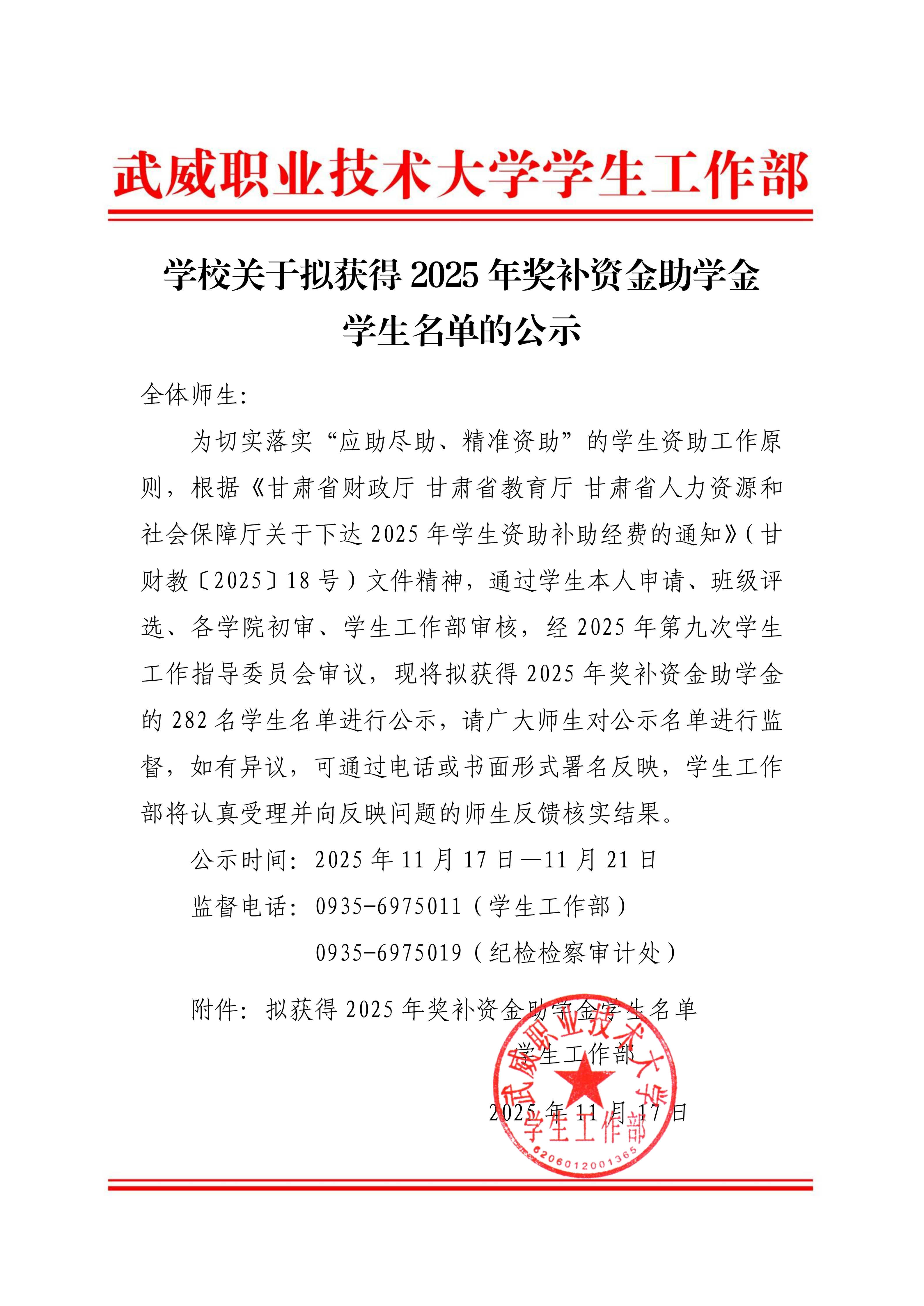 學(xué)校關(guān)于擬獲得2025年獎補(bǔ)資金助學(xué)金學(xué)生名單的公示