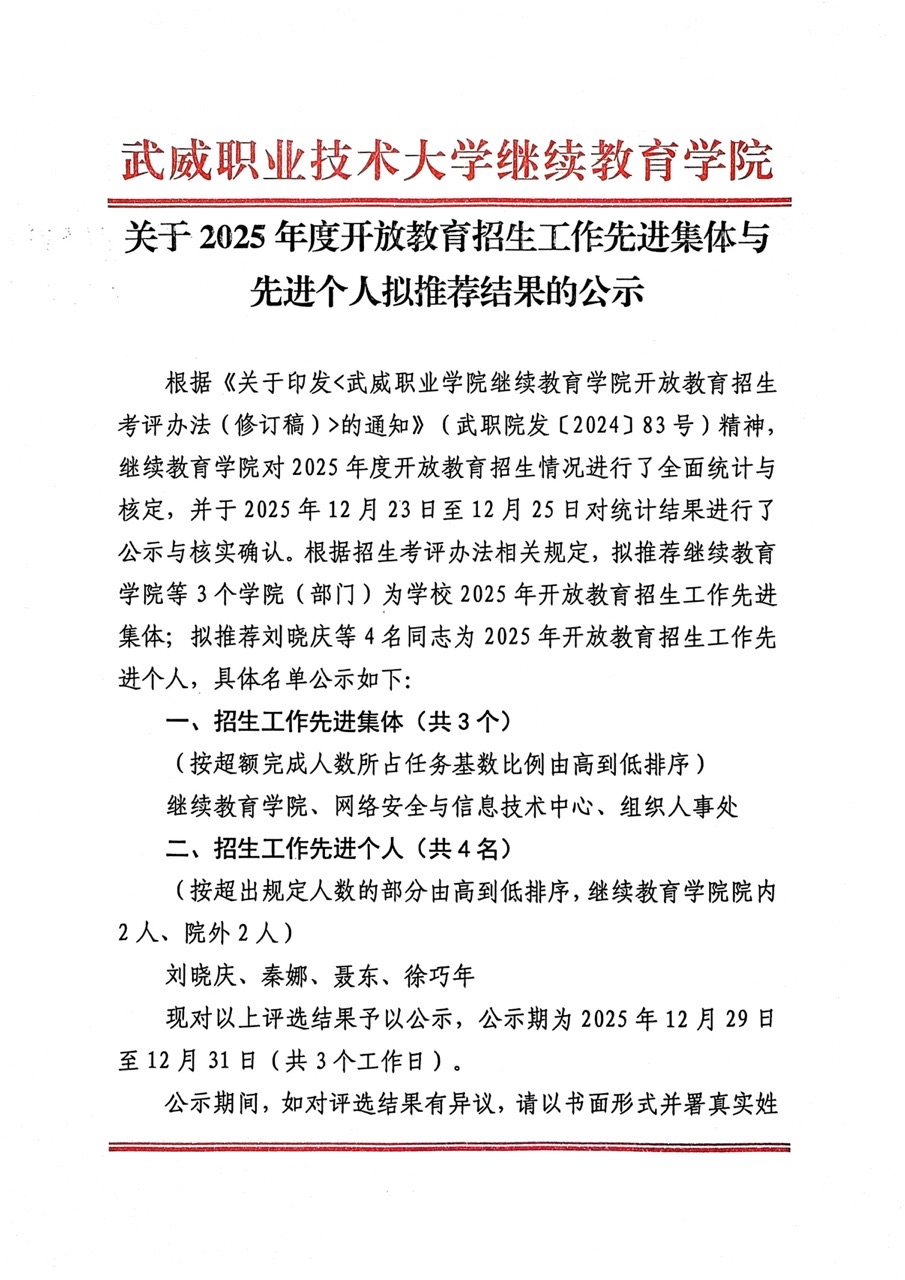 關(guān)于2025年度開放教育招生工作先進集體與先進個人擬推薦結(jié)果的公示