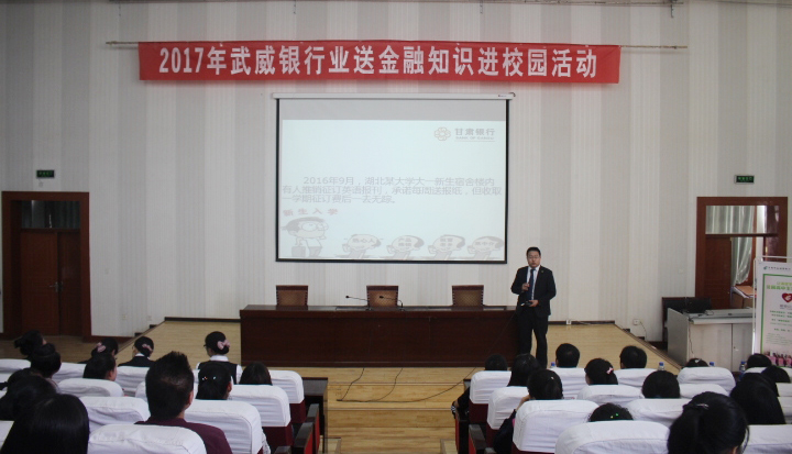 為幫助同學們了解和掌握銀行業(yè)消費常識,增強科學合理使用銀行產品和服務的能力,提升同學們對金融業(yè)務的風險防范和識別能力,5月11日下午,經濟管理系與甘肅銀行武威分行、郵政儲蓄銀行武威市分行在學院正德廳聯合開展了“銀行業(yè)送金融知識進校園”宣講活動。經濟管理系會計電算化、證券與期貨專業(yè)的350余名同學參加了此次宣講會。