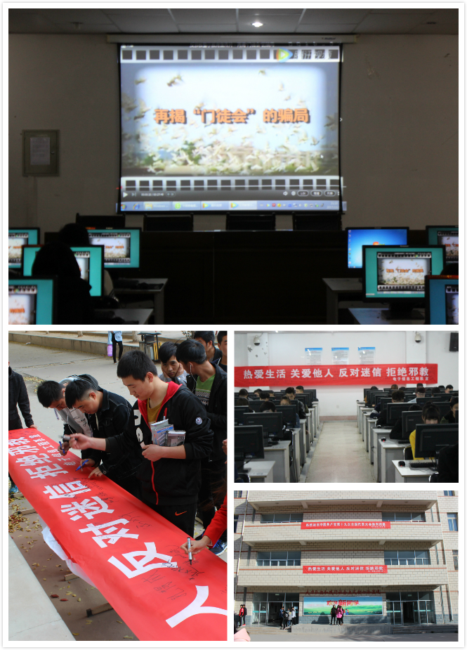 為了建設(shè)和諧校園,維護(hù)社會穩(wěn)定,凈化教育系統(tǒng)校園,電子信息工程于10月30日晚,在尚德樓11號機(jī)房開展了反邪教宣傳片放映活動(dòng)。